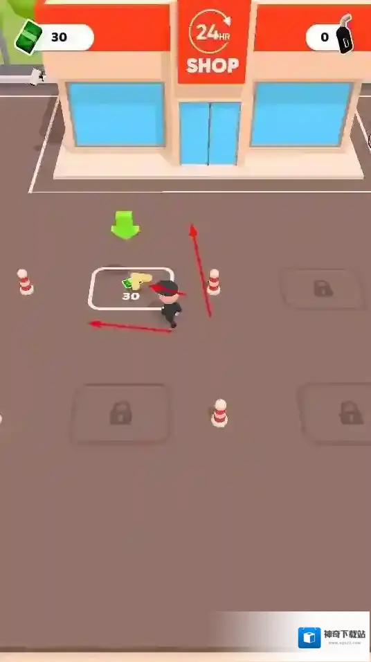 1、玩家操控角色在场景中移动,拾取地上类似钞票的资源,如从标有“30”“45”的区域收集,增加游戏内货币数量。