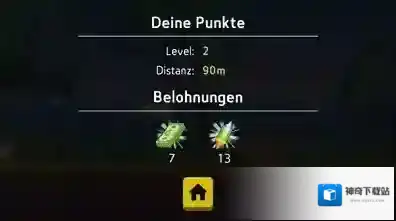 3、“DeinePunkte”、“Level:2”(等级:2)、“Distanz:90m”(距离:90米)、“Belohnungen”(奖励),还有7个金钱图标以及返回主页的房子按钮。