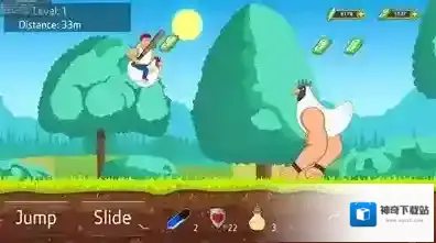 1、界面显示等级、距离,下方有跳跃、滑行、攻击(Attack)等操作按钮,还有类似道具数量显示,画面中有一名手持棒球棍的角色和一个体型巨大的鸡形象敌人。