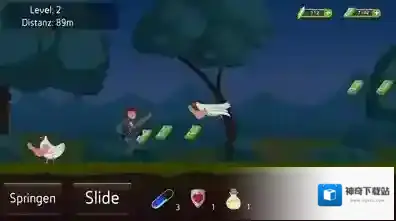 2、界面显示等级(Level:2)、距离(Distanz:89m),下方按钮文字是德语,“Springen”表示跳跃,“Slide”表示滑行,“Angriff”表示攻击,还有道具数量显示。