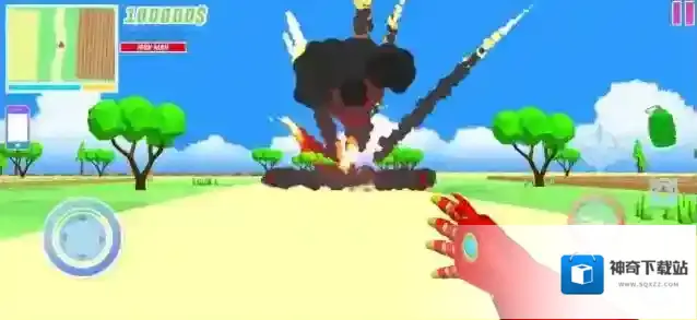 2、呈现了游戏内的场景,角色装备类似钢铁侠的手部武器,界面有金钱显示、角色名,还有地图、手雷等元素,属于开放世界沙盒类场景。