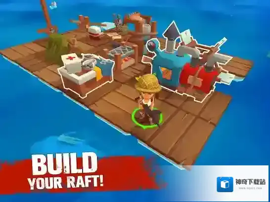 2、屏幕左下角的虚拟摇杆可控制角色移动,操控角色在木筏上及周围水域移动,收集漂浮的资源(如木板)。