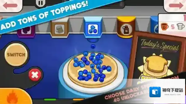 老爹煎饼店togo,经典美食烹饪游戏老爹系列中的一部作品,在本作中,我们将会来到老爹的煎饼店,去学习制作各种美味的煎饼,为顾客们提供最棒的食物!想象一下,在热腾腾的煎饼上撒上各种风味独特的配料,挤上香气扑鼻的酱料,这样一份美味的煎饼怎会不让人心动?而随着店铺等级和经营天数的提高,玩家也会解锁更多的食材和客人,将会体验到更多有意思的煎饼制作挑战!