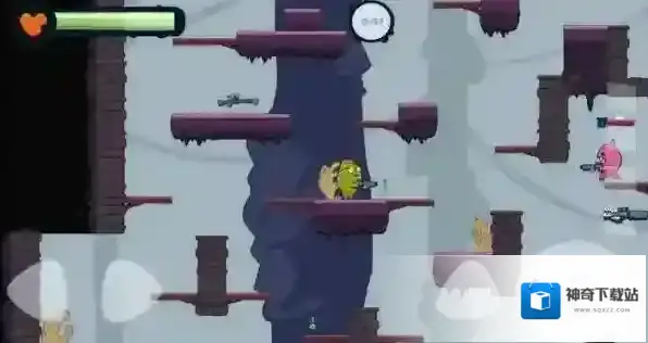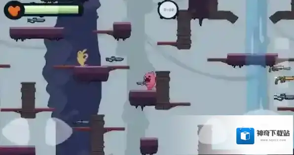 2、呈现横版闯关场景,有粉色火柴人角色、武器、关卡地形等元素,玩家操控角色在关卡中战斗、收集武器、闯关,画面含时间、血量条等界面信息。