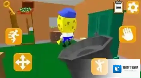 3、画面呈现比奇堡风格场景,有章鱼哥、海绵宝宝经典建筑(如菠萝屋样式等),界面有移动、奔跑、动作等操控按钮,属于海绵宝宝主题的开放世界或冒险探索类。