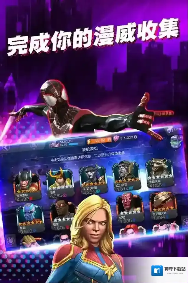 1、收集,升级,并根据漫威漫画情节中的人物关系,妥善地安排队伍中的英雄和反派成员来获得队友加成,越强力的英雄,他们的属性数值、能力以及特殊动作就越强。