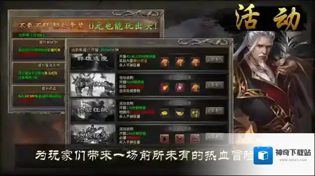1、夺宝奇兵、一马当先、行会争霸等惊喜活动每日准时开放,大量元宝、真充、材料奖励领不停,千万不要错过。