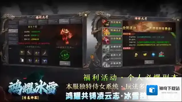 鸿耀冰雪,180单职业冰雪神器版本,独创新颖侍女玩法,体验全新玩法,享受无限激情!本服上线就送光速拾取、自动回收、专属群切、爵位侍女等超多惊喜豪礼,助你轻松开荒砍怪,发育轻松无压力!本服二大陆才是激情的开始,可以爆出游戏内所有的顶级装备和道具,BOSS还可以产出真充灵符,不氪金一样玩的爽,零氪可通关,人人可追梦!