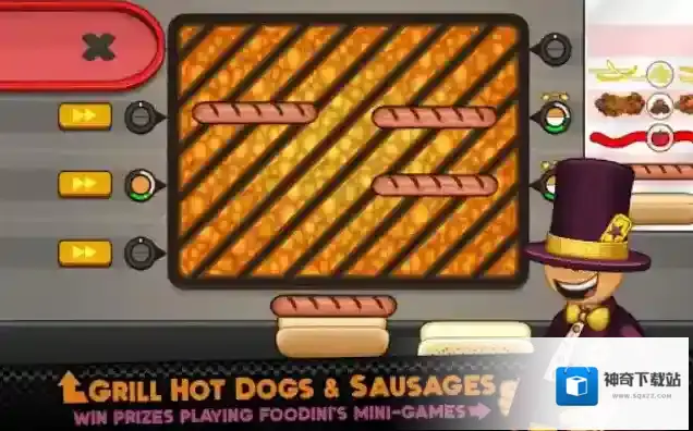 1、记录好客人的需求后,就可以来到第一步煎烤肠,这一步的关键就是翻面时机,待一半的颜色变成橙色后就点击翻面,待另一面变成同样的颜色后就可以拿出来了。
