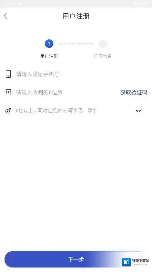 2、进入用户注册界面,依次填写手机号、验证码和密码后,选择下方下一步选项。