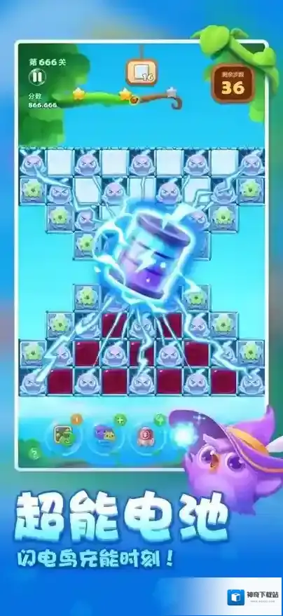 2.送它到中间底层完成链接,通过右侧魔法石一路下压破冰。这一关需要充分利用闪电鸟对角特效,开局青蛙特效点亮魔法石。第二步三消青蛙拿强制礼包,同时把左侧下角的蓝色或绿色闪电鸟强制和银币交换。然后消除中间一行银币,尽量让闪电鸟下到底部并激活。